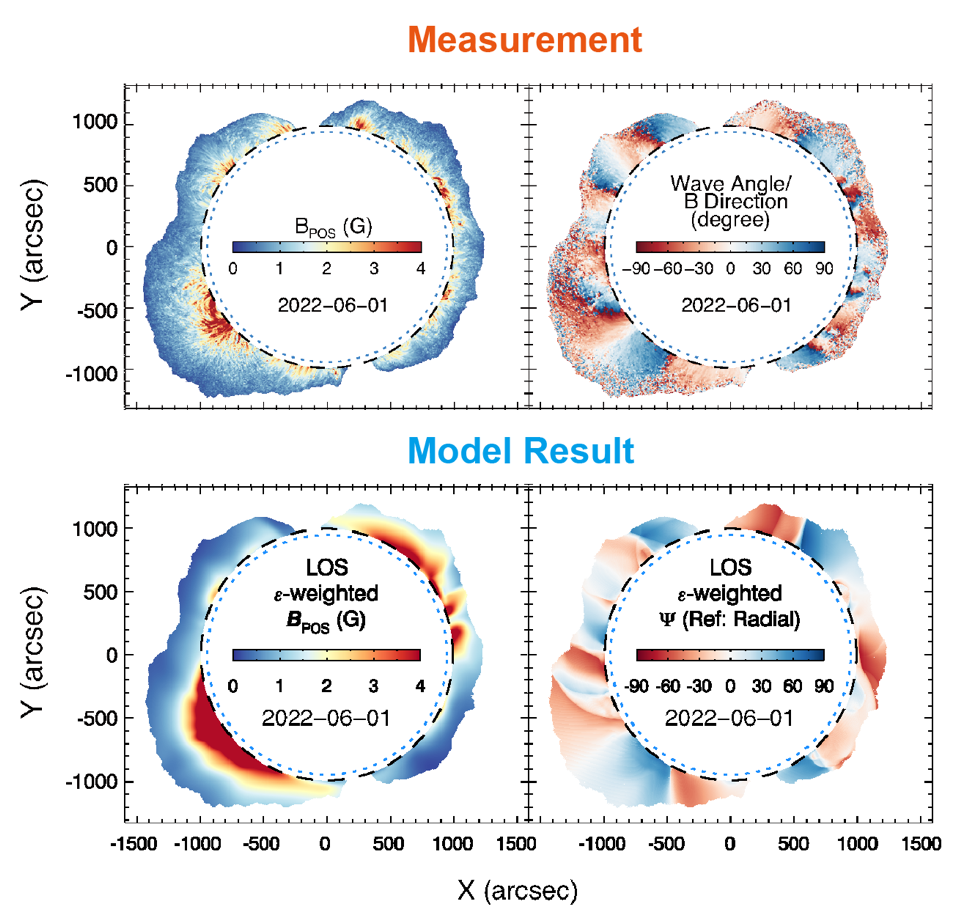 图1. 2022年6月1日UCoMP测量得到的日冕磁场强度(左上)和方向(右上)图与日冕模型中的磁场强度(左下)和方向(右下)图